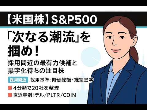 この動画では、S&P500採用への「次なる潮流」を徹底分析。 採用に必要な厳格な基準(時価総額、継続的な黒字など)を解説するとともに、採用準備状況が異なる20社の有力候補を4つのカテゴリーに分類してご紹介します。資産運用・投資